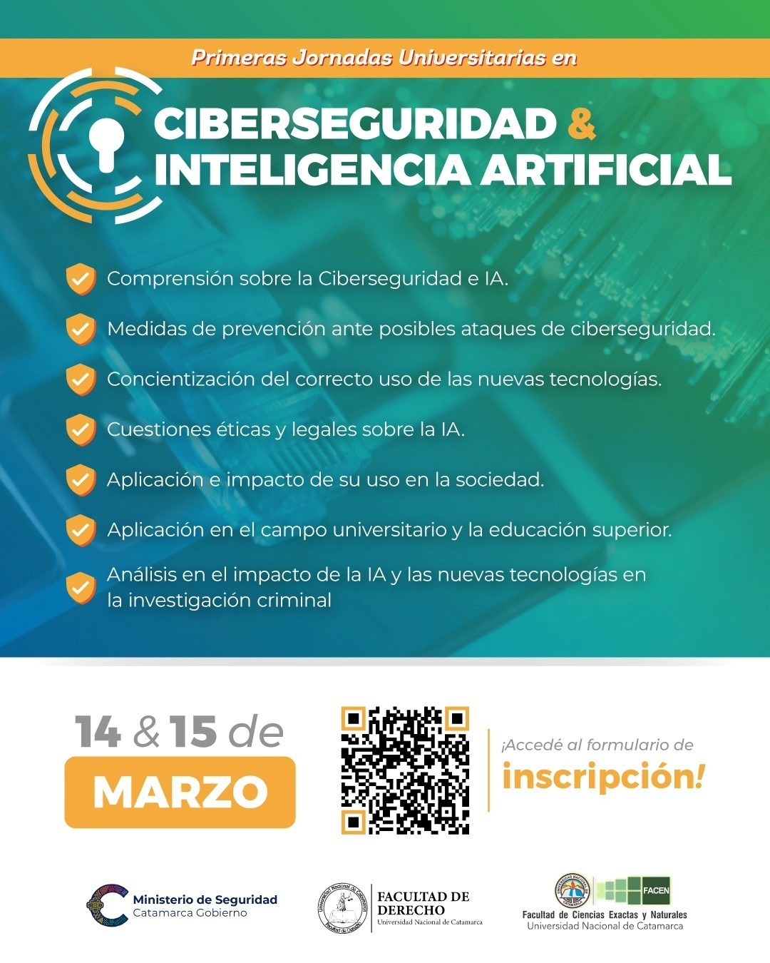 Organizadas por las Facultades de Ciencias Exactas y Naturales y de Derecho de la UNCA, junto al Ministerio de Seguridad de la Provincia, el 14 y 15 de marzo se realizarán, en forma gratuita, las Jornadas de Ciberseguridad e Inteligencia Artificial.
