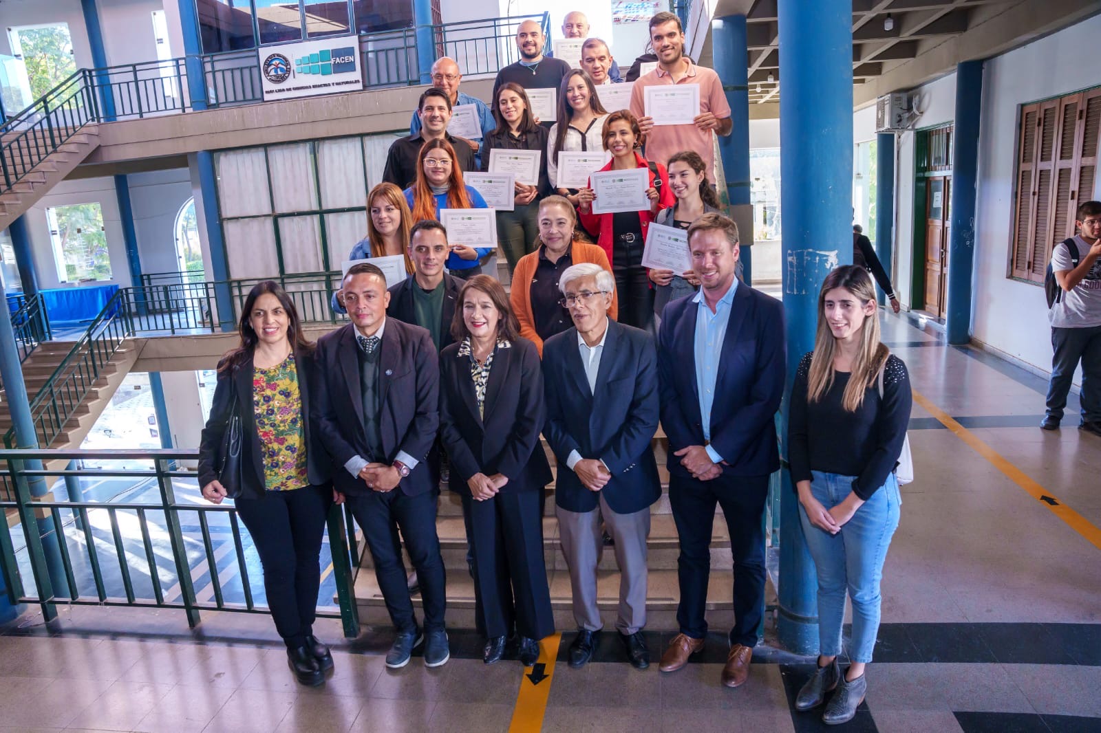 El ministro de Industria, Comercio y Empleo, Sebastián Caria, junto al rector de la Universidad Nacional de Catamarca, Oscar Arellano, y a la decana de la Facultad de Ciencias Exactas y Naturales de la Universidad Nacional de Catamarca, María Beatriz López, hicieron entrega de los certificados a alumnos que finalizaron la Capacitación en Inglés Comunicativo Nivel 2, con orientación a la industria del software, acto que se concretó en el Salón Amarillo de la casa de altos estudios.