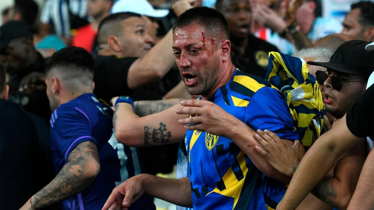 Los incidentes habían comenzado una hora antes del horario previsto para el comienzo del encuentro (21.30), cuando hinchas locales quisieron despojar a los argentinos (no más de 200) de una bandera, pero recrudecieron con más violencia a la hora de ejecutarse los himnos de ambos países.