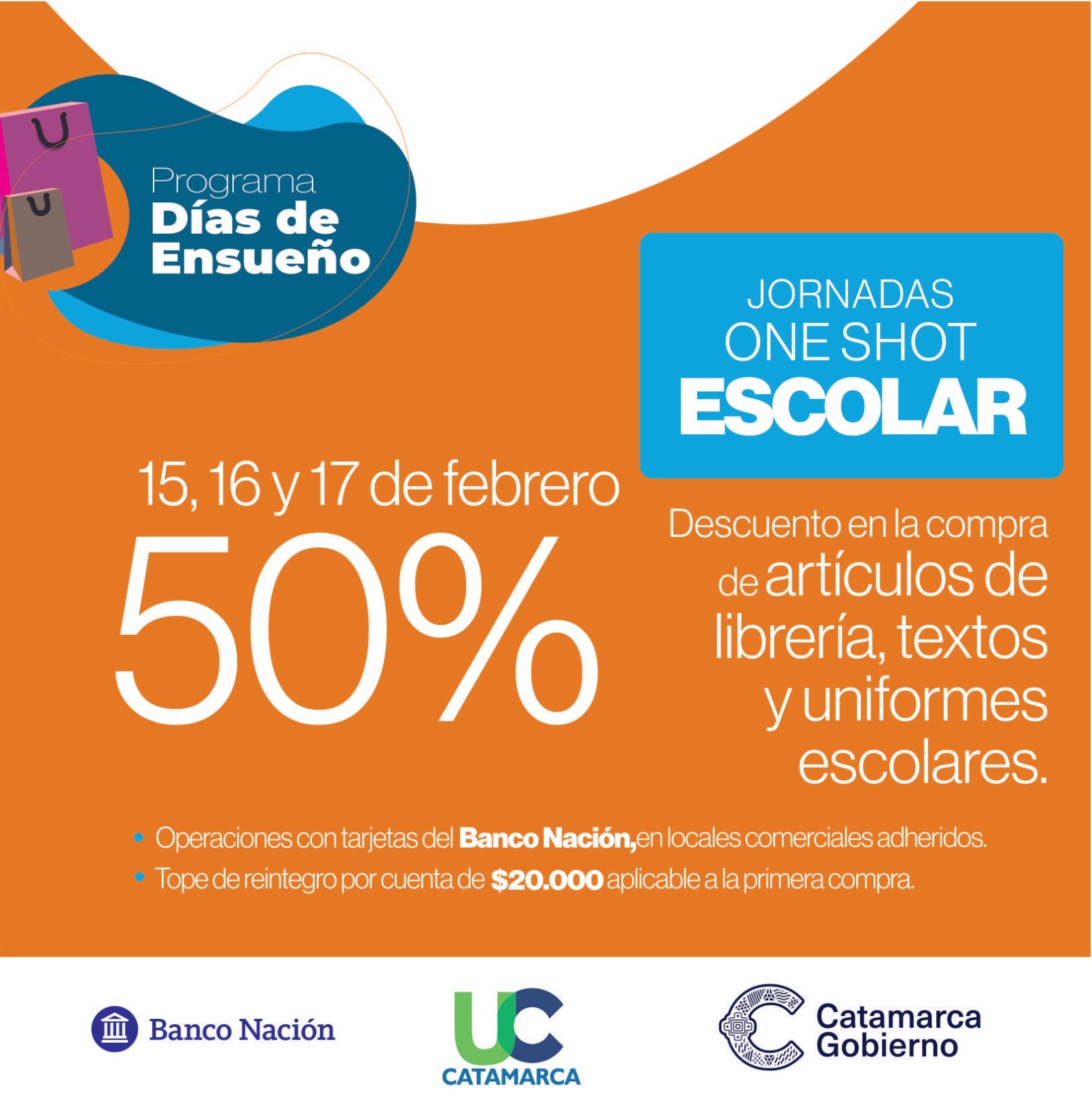 El Ministerio de Economía anuncia que los días 15, 16 y 17 de febrero se llevarán a cabo las Jornadas Especiales One Shot Escolar que podrán aprovechar los usuarios de tarjetas de crédito del Banco Nación Argentina en los comercios adheridos al Programa Días de Ensueño. Se trata de un descuento del 50 % en artículos de librería, libros de texto y uniformes escolares con un tope de reintegro de $20.000 (Pesos Veinte mil) por cuenta, beneficio aplicable a la primera compra.