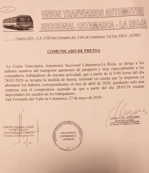 La Unión de Tranviarios Automotor informó hoy el cese de las medidas de fuerza que habían paralizado el transporte publico en la provincia. En el comunicado, el gremio señaló que casi la totalidad de las empresas cumplió con el pago de los salarios adeudados, por lo que se decidió levantar el paro.