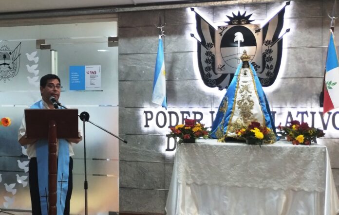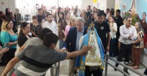 La sagrada imagen ingresó en brazos del Rector del Santuario Catedral, Padre Gustavo Flores y fue recibida en la puerta del Palacio Legislativo por el Vicegobernador de la provincia, Rubén Dusso.