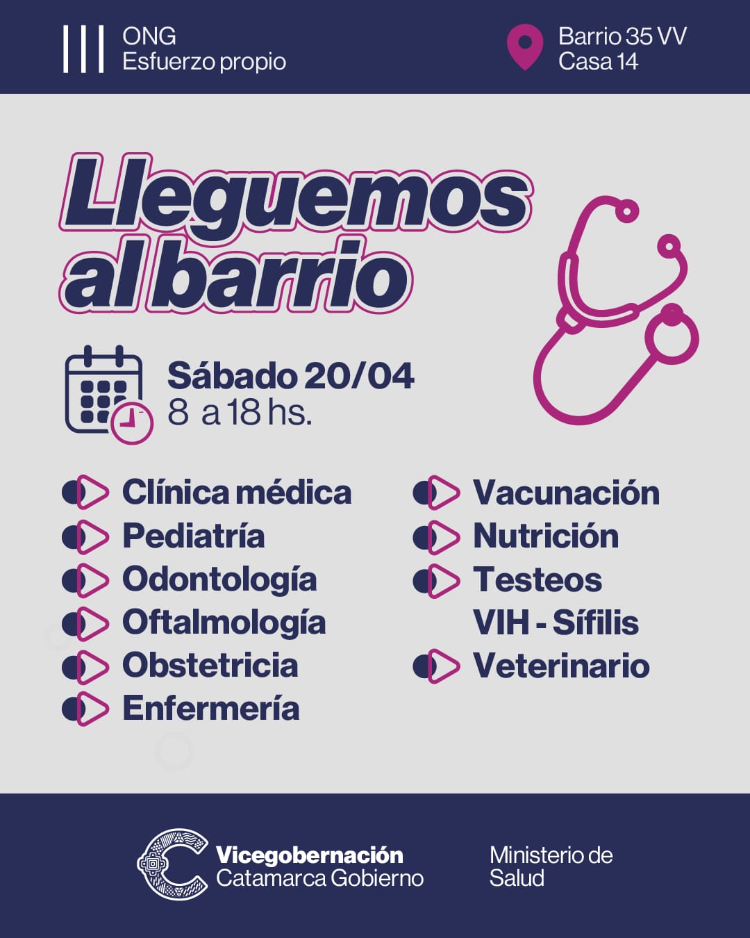 El Ministerio de Salud de la Provincia, a través del Programa Lleguemos al Barrio, brindará asistencia mañana, sábado 20 de abril, en la ONG “Esfuerzo Propio”, ubicada en el B°35 Viviendas casa 14, de 8 a 18 horas.