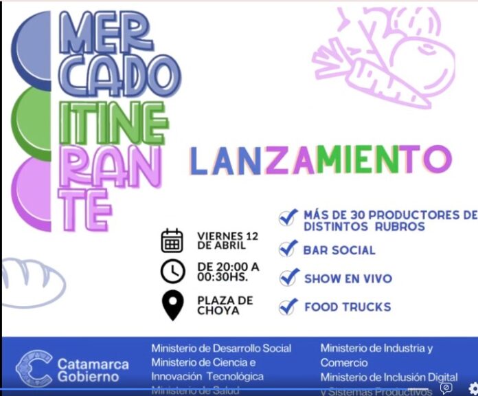 El Ministerio de Desarrollo Social presenta Mercado Itinerante, el día viernes 12 de abril a las 20 hs, en La Plaza de Choya. Contará con espectáculos en vivo, Food Trucks, Bar social. Es una alternativa que abre paso a nuevas economías, en un trabajo coordinado en conjunto con distintos Ministerios y Municipios.