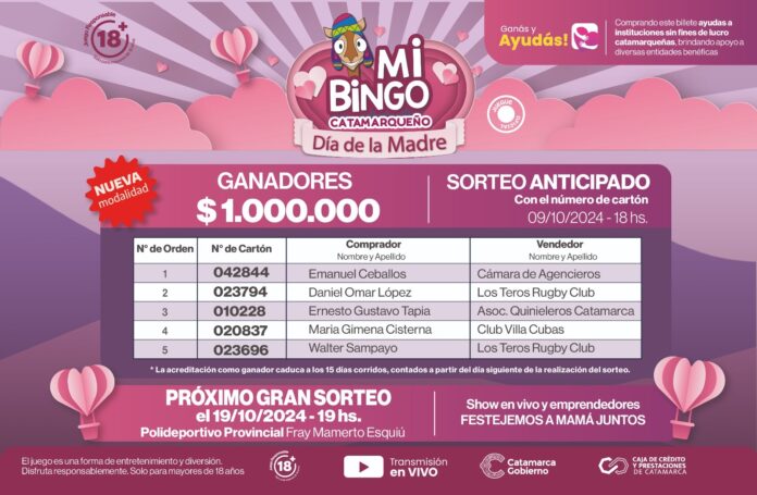 Hoy se llevó a cabo el sorteo anticipado de «Mi Bingo Catamarqueño», edición especial por el Día de la Madre, en la Caja de Crédito y Prestaciones de Catamarca.