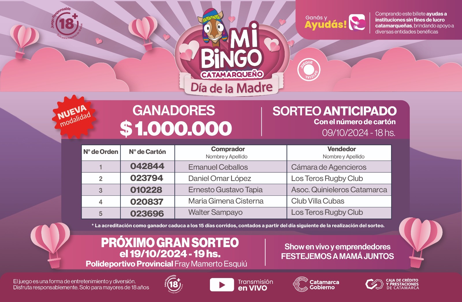 En esta nueva modalidad implementada por La Caja, se sortearon 5 millones de pesos distribuidos en cinco cartones, cada uno con un premio de 1 millón de pesos.