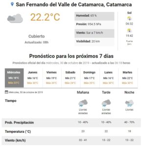 Con una alta probabilidad de lluvias, se espera una jornada fresca en San Fernando del Valle de Catamarca hoy.