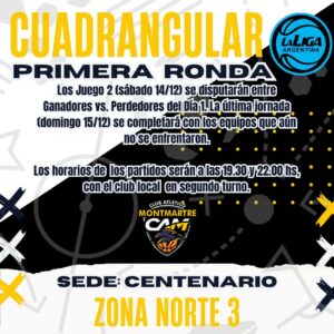 Montmartre viene de ser sexto en la etapa regular y comenzará jugando en el cuadrangular este viernes, desde las 22 hs, con el dueño de casa, Centenerio. En la segunda jornada de competencia a desarrollarse el sábado, se medirán Ganadores vs Perdedores. El domingo, completando la actividad, se enfrentarán los equipos que aún no hayan jugado entre sí. Los horarios de juego son 19.30 y 22 hs, siempre con el local en el segundo turno.