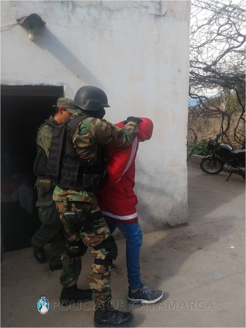 Al culminar con las medidas Judiciales, que se extendieron hasta pasada las 15:00 de la tarde de hoy, quedaron en calidad de detenidas cinco personas del sexo masculino de 30, 32, 38, 39, y 41 años de edad; entre ellos un Oficial Subinspector de Policía de la Provincia, quienes fueron alojados en dependencias policiales a disposición de la Justicia interviniente, mientras que una joven mujer de 29 años, Cabo de Policía de la Provincia, quedó supeditada a la causa, en virtud que las pesquisas habrían indicado a los investigadores que en los lugares allanados se comercializaría la sustancia estupefaciente al menudeo, teniendo vinculación con las nueve personas detenidas días pasados en las provincias de Santiago del Estero y Tucumán, sospechadas de integrar una banda dedicada a introducir drogas en distintas provincias del país, incluida Catamarca, que luego era fraccionada y comercializada, quedando con estos procedimientos totalmente desarticulada la misma.