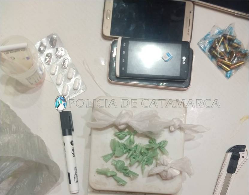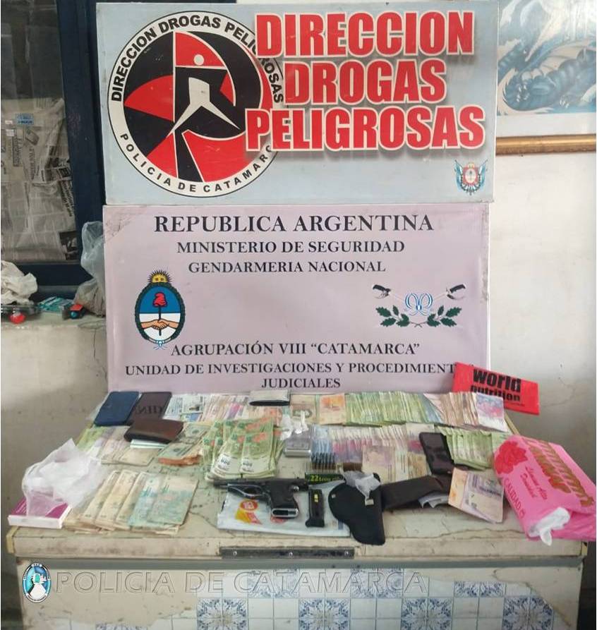 Tras irrumpir en domicilios ubicados en la calle Sargento H. Blas al 2.000, en calle Ayacucho al 1.900, en el Pasaje Vélez Sarsfield al 1.800, en la esquina del Pasaje mencionado y calle Gobernador Acuña, y en el barrio 14 de septiembre de la localidad de San Isidro, Dpto. Valle Viejo, con la colaboración de efectivos de las Divisiones Infantería, de Operaciones Especiales Kuntur, de los Grupos de Intervención Rápida (GIR Norte y Sur), de la División Cuerpo de Infantería Femenino, y del Grupo de Infantería de Zona Norte de la Unidad Regional N° 1, el personal interviniente secuestró gran cantidad de dosis de Cocaína y Marihuana, listas para ser comercializadas, elementos para fraccionar la sustancia estupefaciente, alrededor de ciento cuarenta y dos mil pesos ($142.000) en efectivo, veinte dólares estadounidenses, veintidós (22) teléfonos celulares de distintas marcas y modelos, varios chip de telefonía celular de distintas empresas, una (1) tablet, dos (02) pistolas Bersa calibres 9 y 22 mm. respectivamente, un (01) revólver calibre 32 mm., un (01) rifle aire comprimido calibre 5,5 mm., una (01) pistola neumática a gas calibre 4,5 mm., cincuenta y dos (52) cartuchos de distintos calibres, cinco (05) motocicletas: una Motomel 200 cc., una Honda Tornado 250 cc., una moto de competición armada con distintas motopartes, una Yamaha FZ 160 cc., y una Yamaha Crypton 110 cc., y dos (02) automóviles: un Peugeot 408 y un Volkswagen Fox.