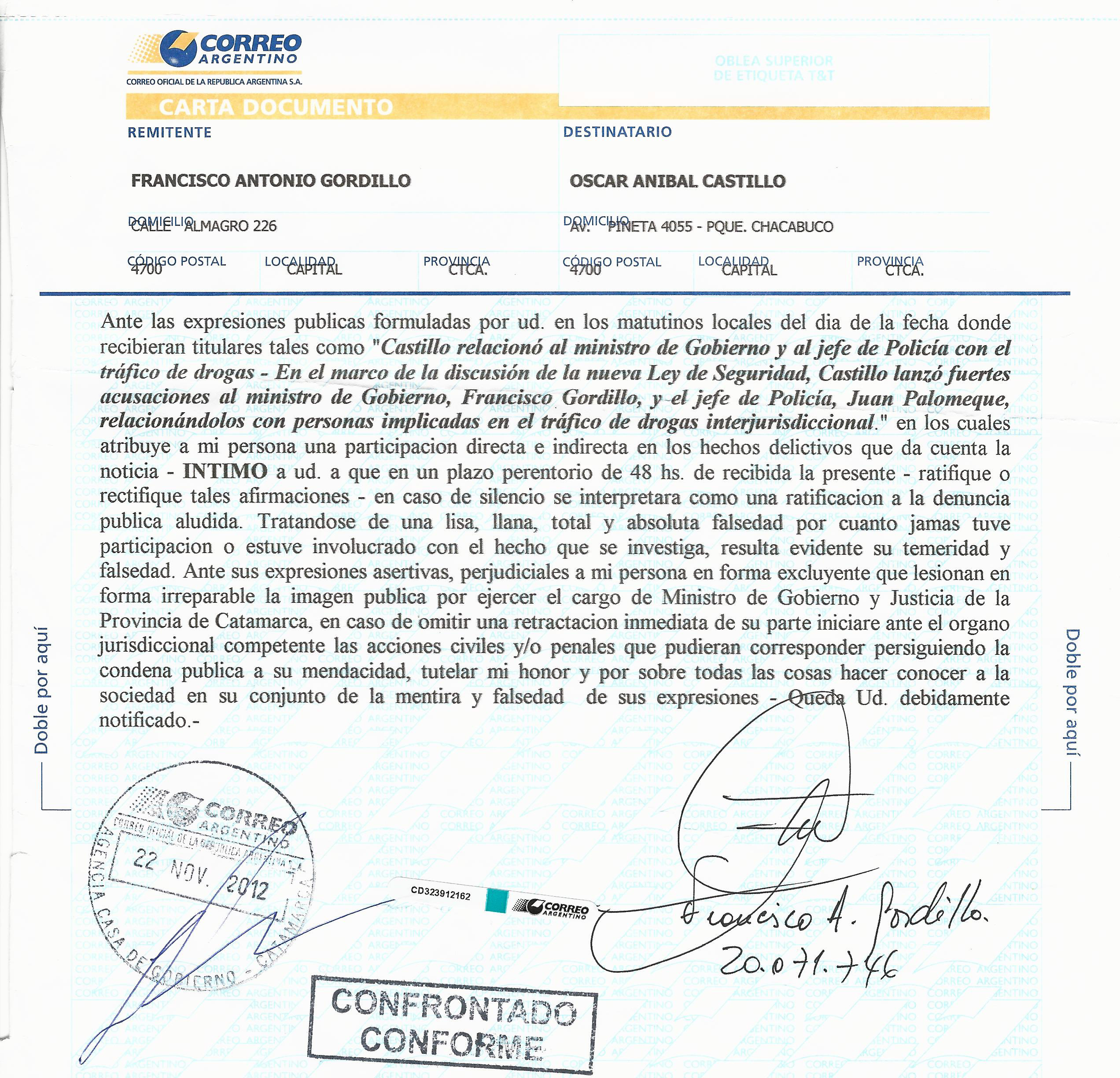 Saadi fue más allá y señaló que cuando Castillo comenzó a intentar relacionar a Gordillo con Alanís y el tráfico de estupefacientes, el actual intendente lo intimó a rectificar o ratificar sus dichos. Y Castillo dio rápidamente marcha atrás al responderle a Gordillo por carta documento que «nunca he tenido el propósito de lesionar su honor, ni circunstancias personales suyas que desconozco» (se adjuntan facsímiles de ambos documentos).