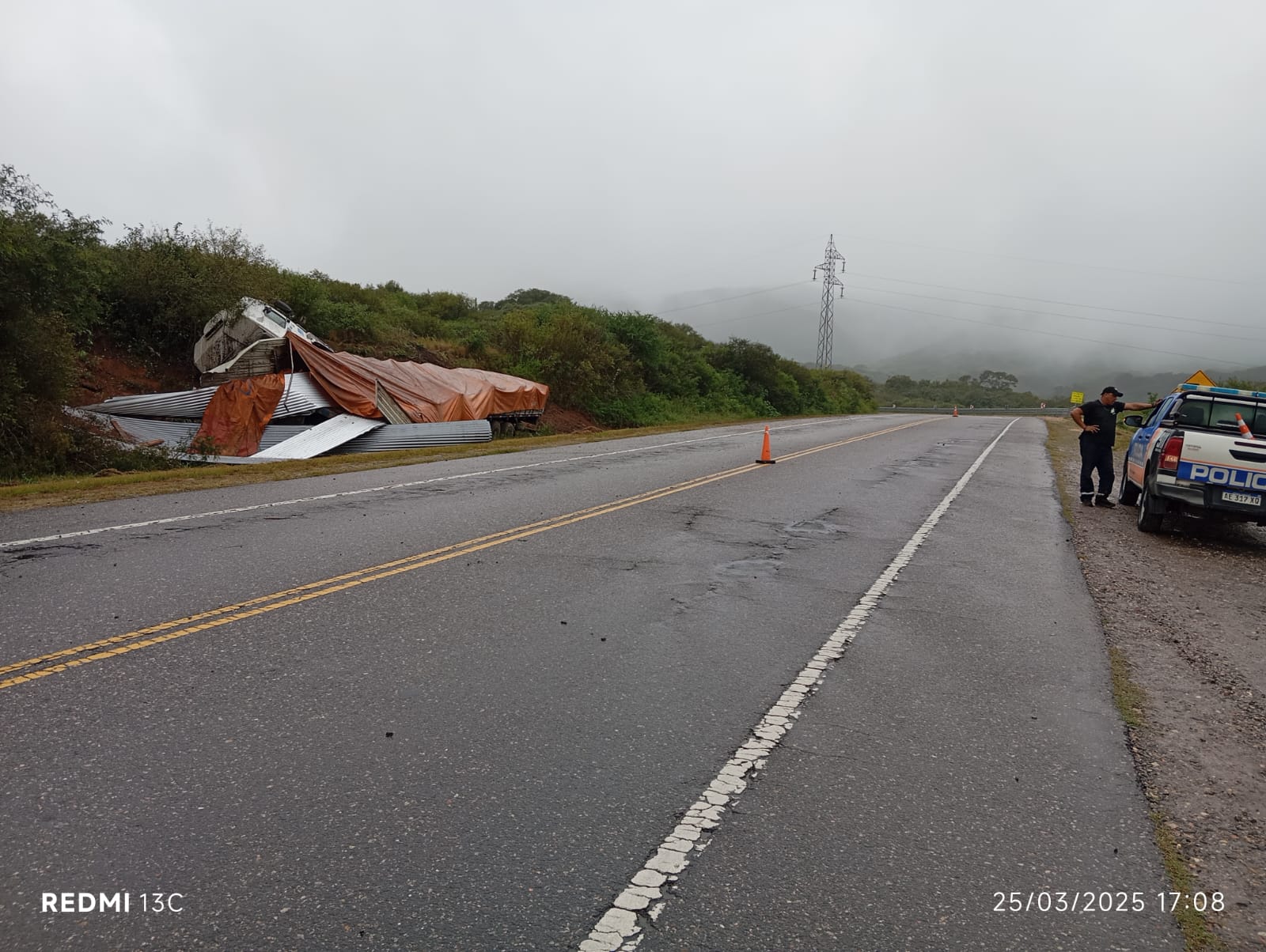 Vialidad Nacional informa que se debe transitar con precaución por Ruta Nacional 38, en la Cuesta del Totoral y a la altura del kilómetro 631, donde equipos especiales trabajan para retirar el camión que volcó ayer a la tarde.