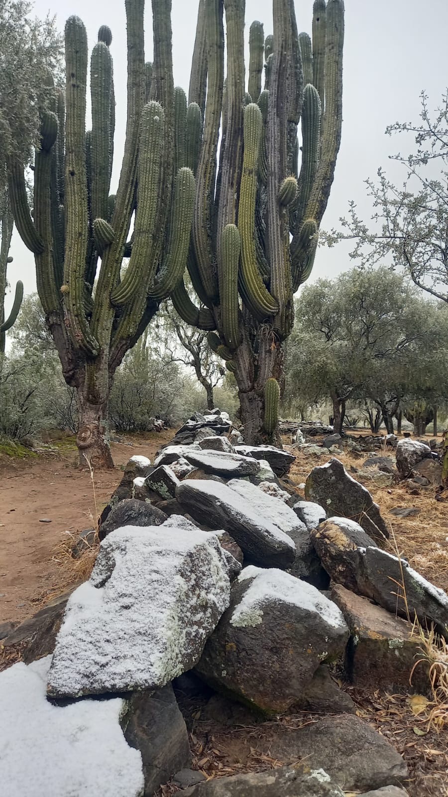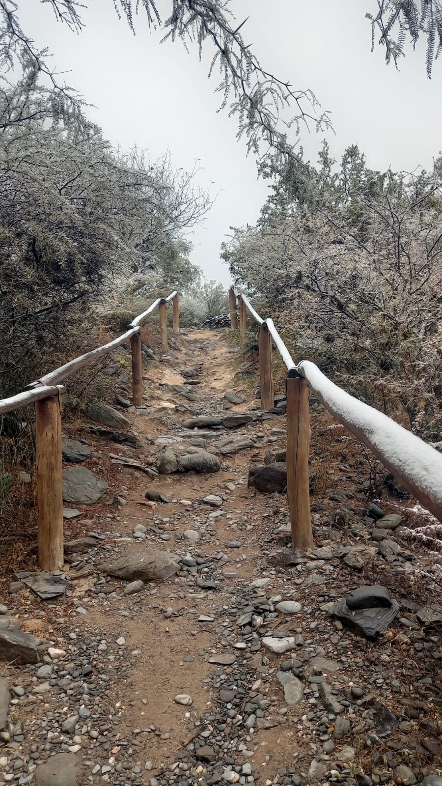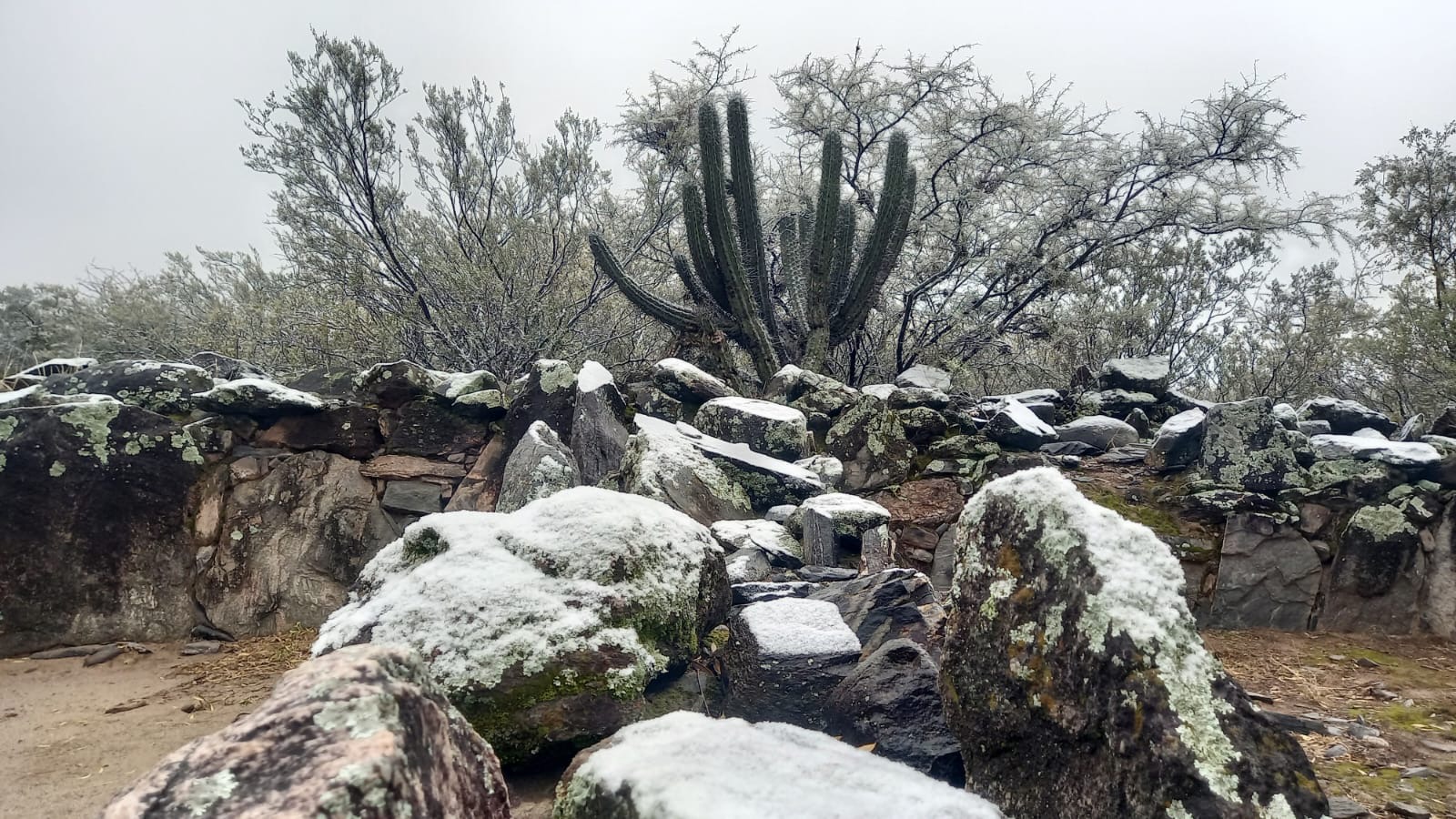 De esta manera, el manto blanco cubrió las barandas del trayecto, los senderos, la vegetación y los recintos construidos con piedra y barro que conforman el sitio arqueológico de la cultura La Aguada, ubicado a una altura de aproximadamente 700 metros sobre el nivel del mar y a unos 40 metros sobre el nivel del río El Tala, cerca del Balneario Municipal.