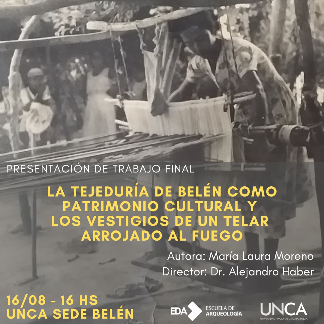 La Escuela de Arqueología de la UNCA anuncia que el próximo 16 de agosto a las 16:00 horas en la Sede de la UNCA en la ciudad de Belén, tendrá lugar la presentación oral del trabajo final de la estudiante de la Licenciatura en Patrimonio Cultural, María Laura Moreno.