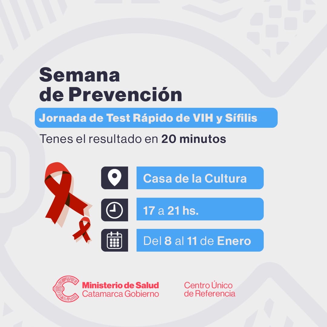 Para una detección rápida e información preventiva, el Ministerio de Salud a través del Centro Único de Referencia realizará esta semana testeos de VIH y Sífilis.