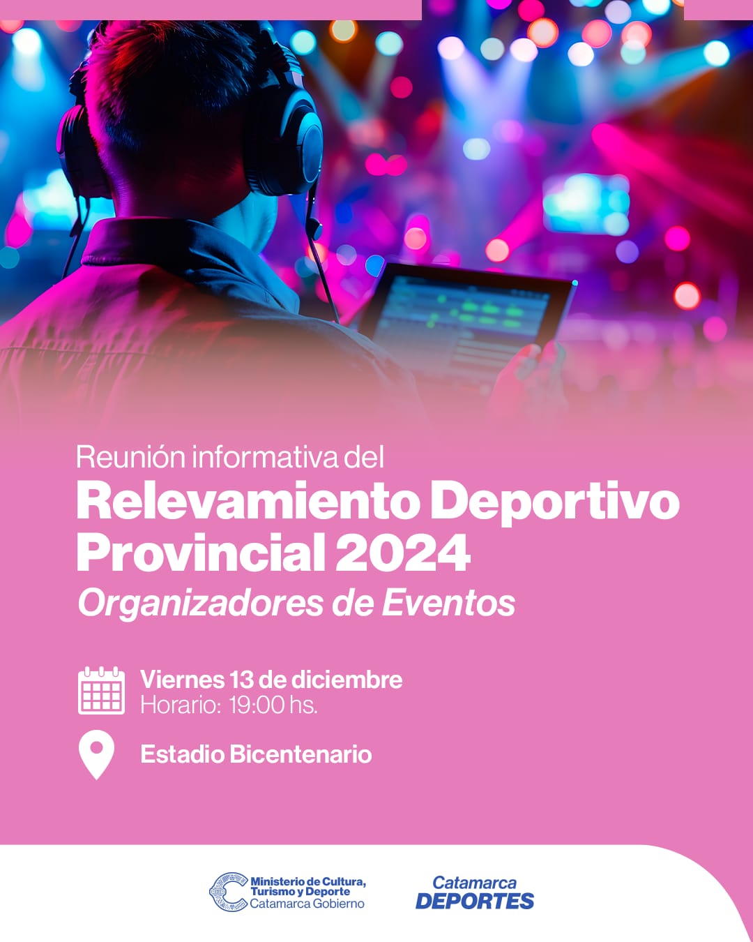 La Secretaría de Deportes y Recreación, a través de de su Dirección de Rendimiento Deportivo, realizará este viernes 13, a las 19 hs, en el Estadio Provincial Bicentenario una reunión informativa con organizadores de eventos deportivos.