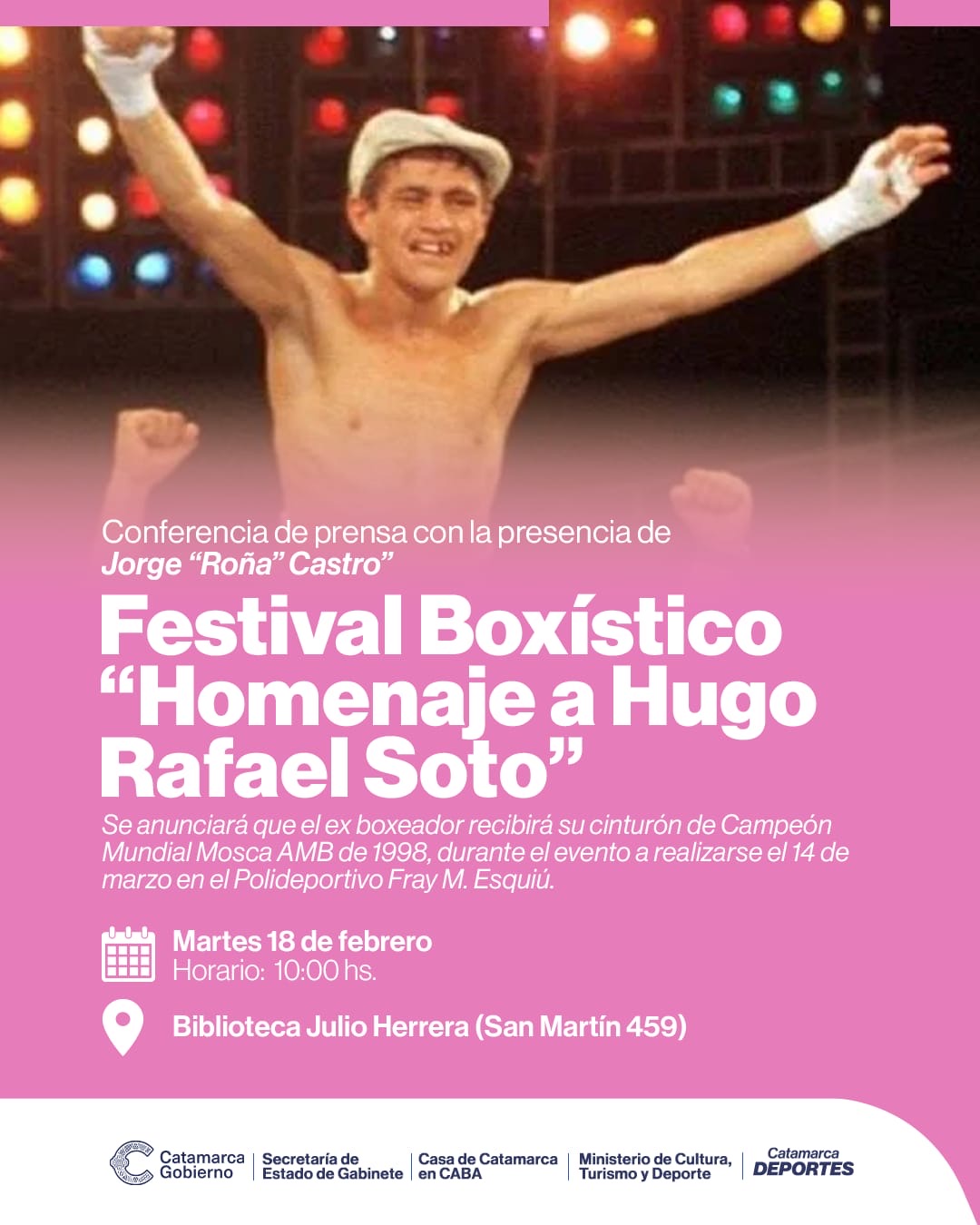 La presentación de ese festival se realizará este martes, desde las 10 hs, en la Biblioteca Julio Herrera, ubicada en San Martín 459 con la exhibición del cinturón de Campeón Mundial Mosca AMB que conquistó «Sotito» en 1988.