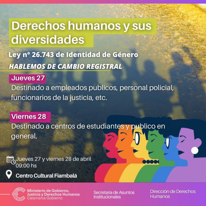 Con el objetivo de promover los derechos de todas las identidades sexo-genéricas y fomentar la accesibilidad a los derechos sexuales, (no) reproductivos y reproductivos, de las personas de nuestra comunidad, se realizará una charla sobre “Derechos Humanos y sus diversidades” y el cambio registral, en el marco de la Ley 26.743.