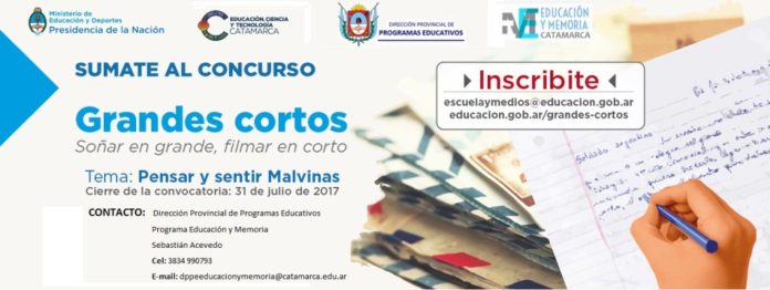La Dirección provincial de Programas Educativos, a través del Programa Educación y Memoria informa que se encuentran abiertas las inscripciones para participar del concurso “Grandes Cortos” con la temática “Pensar y sentir Malvinas”. El mismo, está dirigido a alumnos de escuelas secundarias de gestión estatal y tiene como finalidad incentivar a los jovenes para que escriban historias a partir de un tema que se encuentra en los programas curriculares. Para ello los participantes deberán leer, investigar, escribir y poner en juego un conjunto de habilidades.