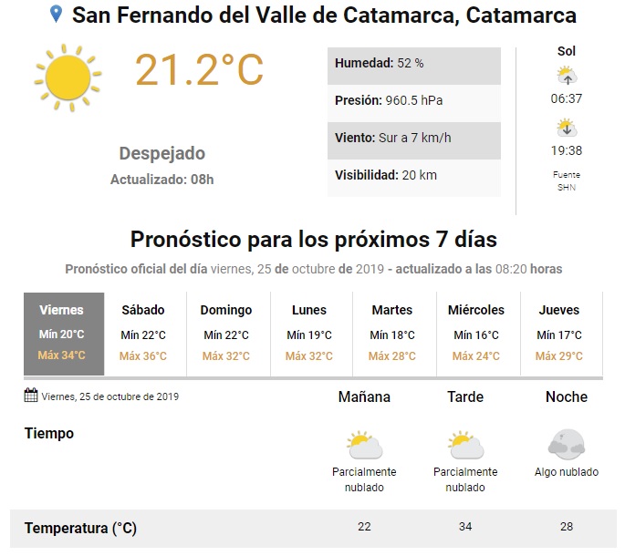 El SMN pronostica una máxima de 34 grados para este viernes en San Fernando del Valle de Catamarca.