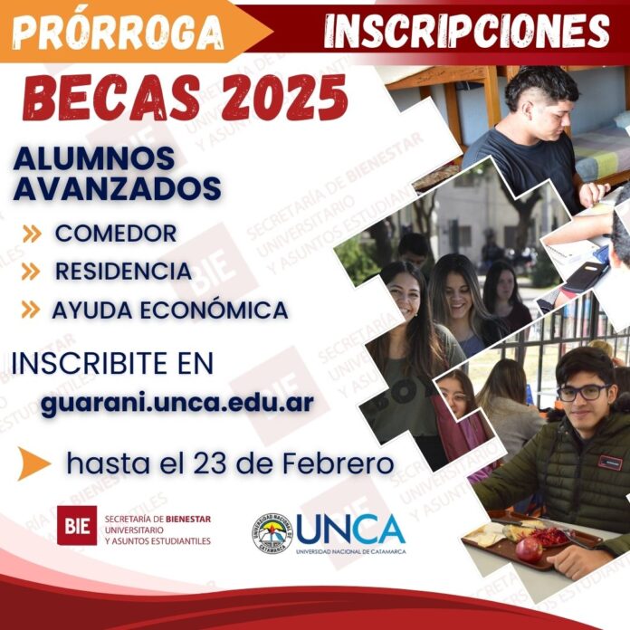 La Secretaría de Bienestar Universitario y Asuntos Estudiantiles de la Universidad Nacional de Catamarca, comunica a los estudiantes que se prorroga hasta el 23 de FEBRERO la inscripción a las Becas 2025 de Comedor, Residencia y Ayuda económica.