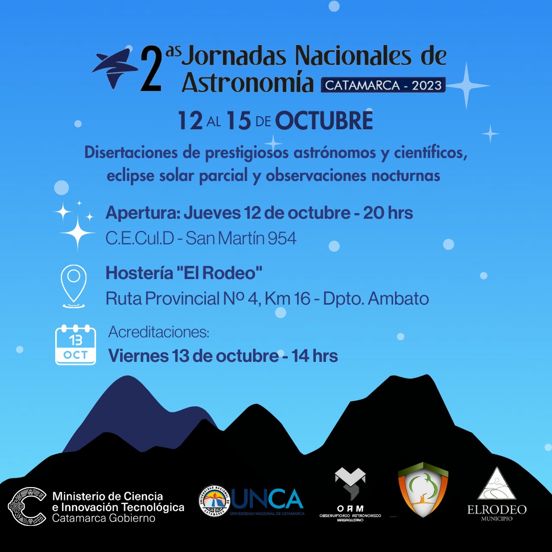Llegan las 2das Jornadas Nacionales de Astronomía – Catamarca 2023. Las mismas se llevarán a cavo el 12 de octubre a las 20 hs en el C.E.Cul.D. (San Martín 954), y será el comienzo de una experiencia astronómica sin precedentes.