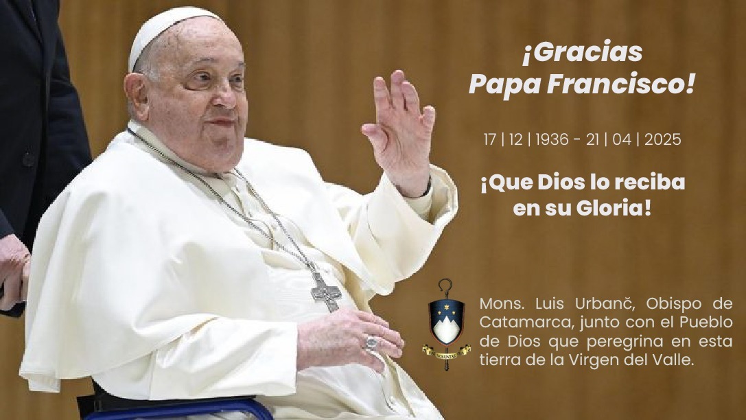 La Iglesia Diocesana de Catamarca confía a la misericordia de Dios el alma del querido Papa Francisco, peregrino de esperanza, quien fue llamado por Dios en este luminoso 21 de abril, lunes de la octava de Pascua del Año Jubilar.