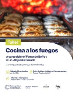 El próximo sábado 22 de noviembre, de 9 a 12 horas, se realizará el taller gastronómico “Cocina a los fuegos: técnicas de cocción, manejo del fuego y manipulación de alimentos”, a cargo del chef Fernando Boffo y la licenciada en Bromatología Alejandra Brizuela. Esta actividad, que cuenta con el respaldo de la Dirección Provincial de Patrimonio Cultural, tendrá lugar en el patio de vinos de Gustos Catamarqueños, ubicado en Pasaje Zambonini 1147.