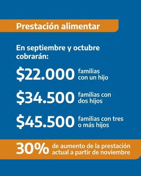 El Ministerio de Desarrollo Social oficializó este miércoles el pago de refuerzo complementario de la Prestación Alimentar (ex Tarjeta Alimentar) de hasta $ 23.000 en dos cuotas iguales a liquidarse en septiembre y octubre 2023.