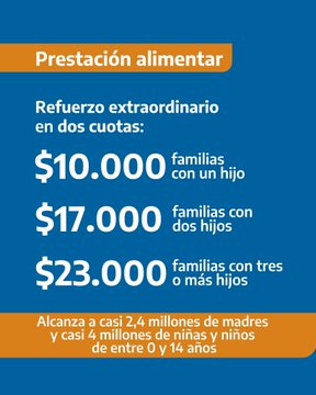 Las sumas aplicables para el pleno de titulares de la Asignación Universal por Hijo (AUH), Asignación Universal por Embarazo (AUE) y Madres de Siete Hijos o más beneficiarias de la Pensión No Contributiva (PnC) ANSES, forma parte del paquete de medidas de Protección Social anunciadas el domingo por el ministro de Economía y candidato a presidente de Unión por la Patria, Sergio Massa.