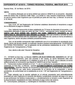De no hacer efectivo el pago, “La Merced quedará automáticamente suspendido en forma provisional, debiendo disputar los encuentros programados con el consecuente descuento de tres (3) puntos”.
