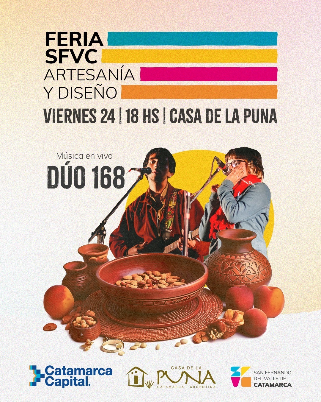 En tanto que el viernes las actividades estarán centradas en la Casa de la Puna de 18 a 22 hs. con el desarrollo de la Feria de Artesanía & Diseño que contará con la presencia de emprendedores de diversos rubros quienes expondrán sus artesanías, productos orgánicos, productos regionales y objetos de diseño. Además habrá música en vivo con la actuación del Dúo 168.